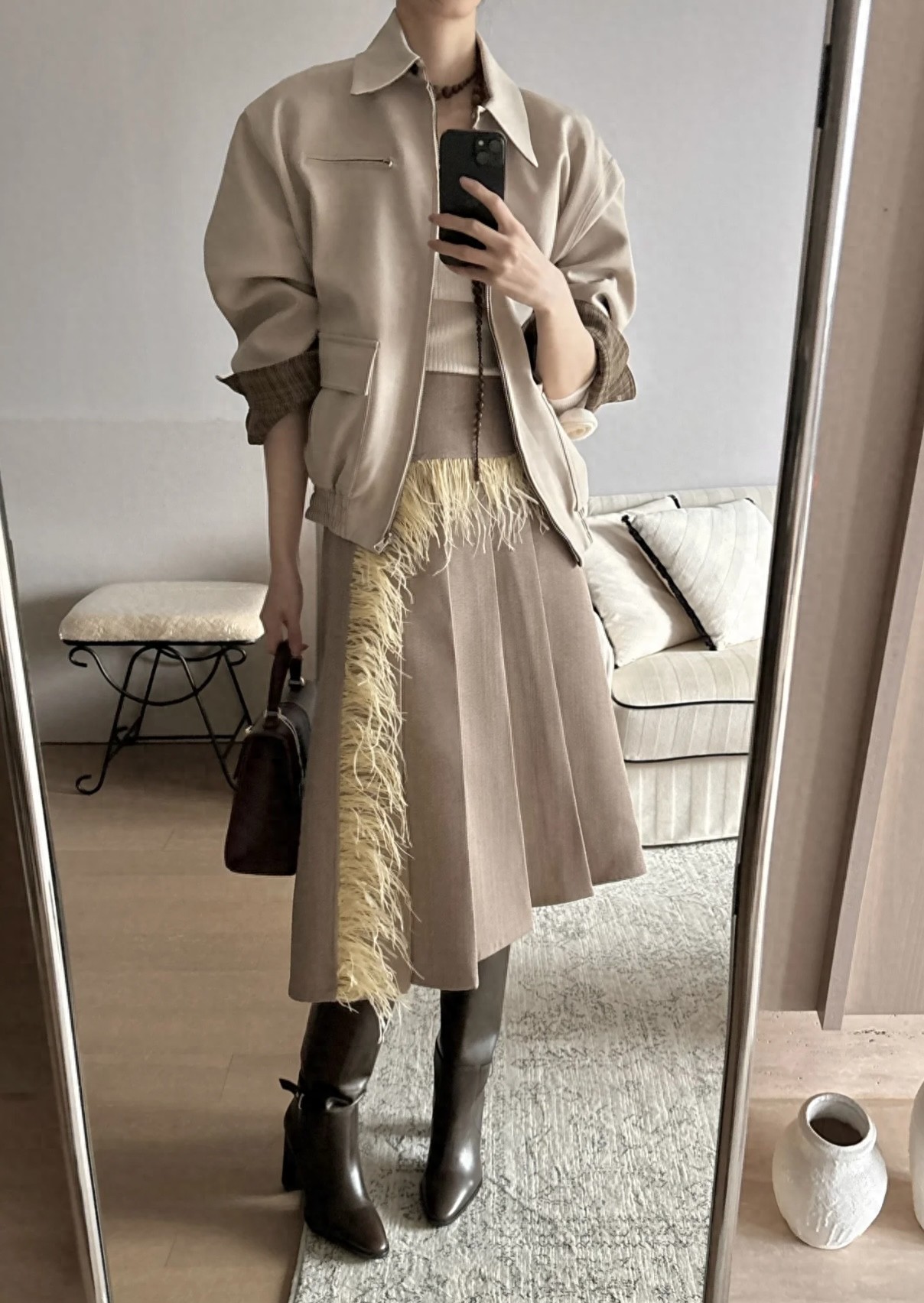 线条感是穿出老钱风的关键,所以一般用短款上衣或者高腰裙子、裤子加以搭配。棕色羊羔毛短款外套配上棕色鱼尾半身长裙,裙身上的亮片点缀与棕色复古皮靴相呼应。