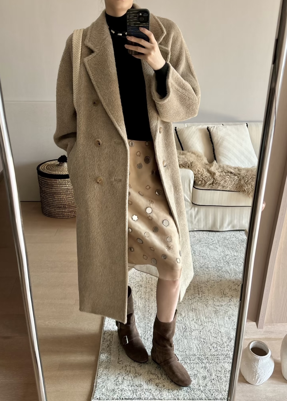 驼色绝对是秋冬必备的基础色系之一,黑色半高领毛衣配上卡其色亮片半身短裙,驼色羊绒外套的加持让色彩高度有质感,轻松拿捏老钱风。