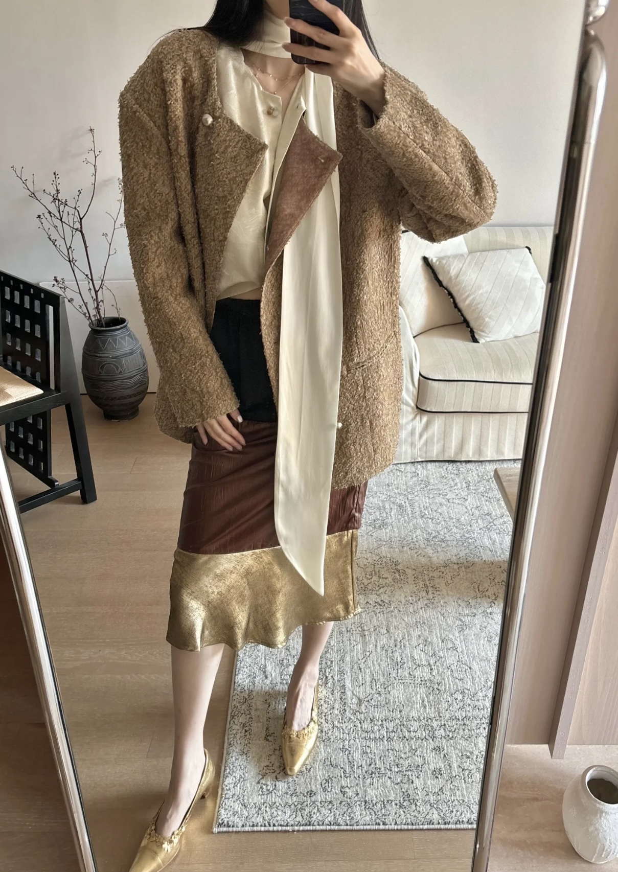 老钱风的强调在于优雅、质感、高级等,所以在选择服装面料上要非常的注重。驼色不规则质感羊绒大衣配上同色系复古文艺纱裙,视觉上给人的第一印象就是高级感满满。