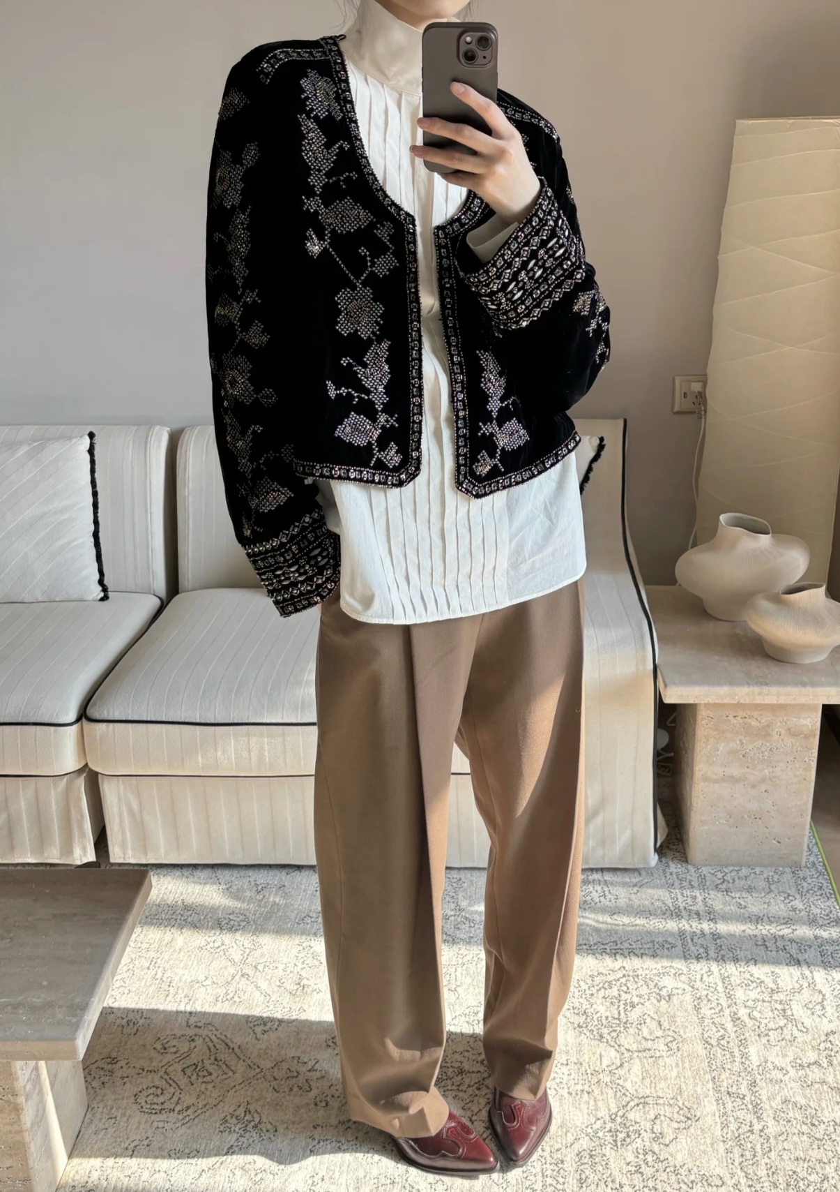 老钱风从上个世界流行至今不无道理,精致的铆钉工艺装饰在黑色羊绒外套上,重工且有细节,配上缎面立领衬衫和棕色西裤,大地色系的最佳运用搭配都在这儿了。