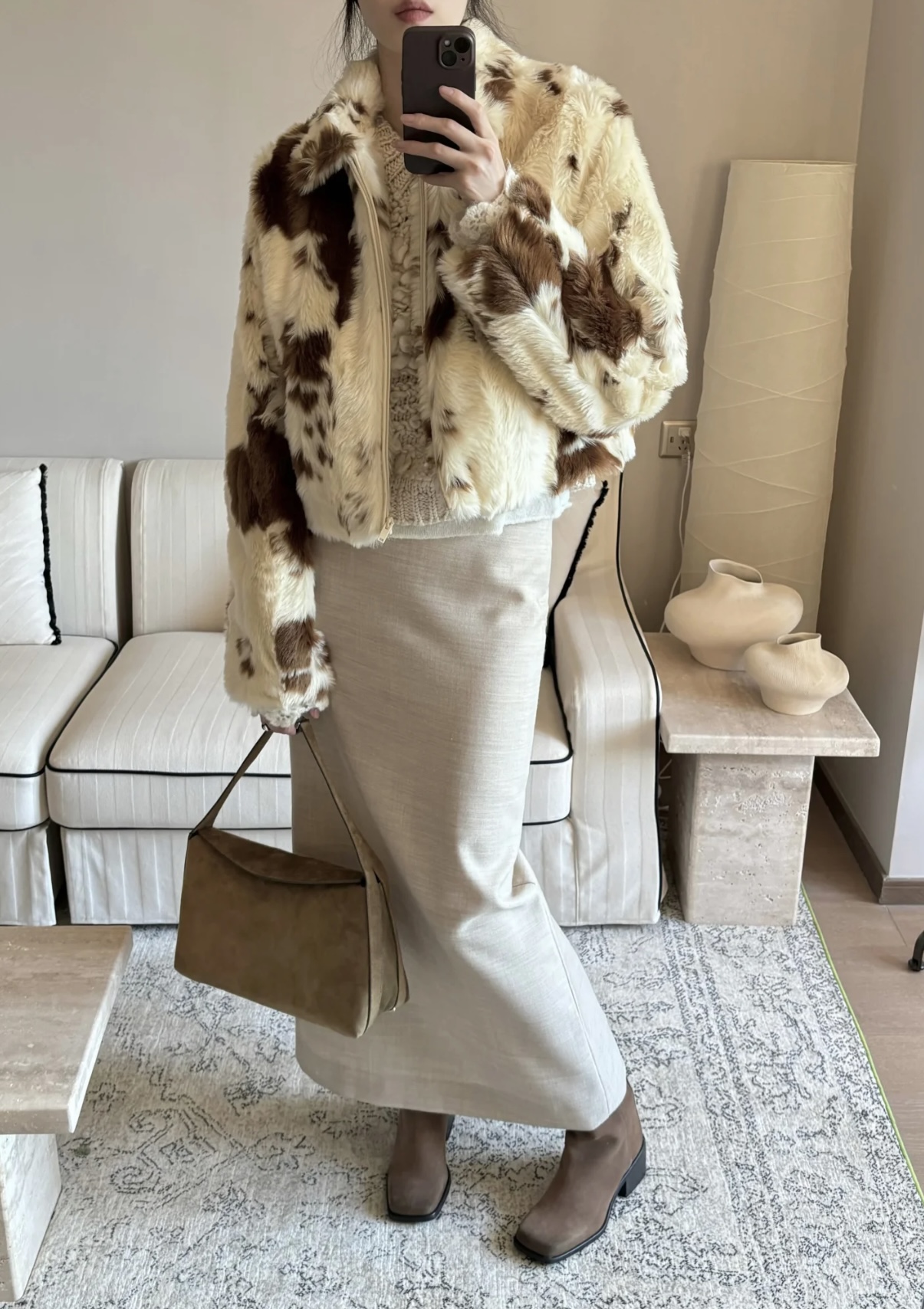 奶牛纹皮草是比较有个性的单品,所以配上一条纯色修身长裙作为点缀,既能凸显身材曲线,又能让整套造型变得更加低调、慵懒。