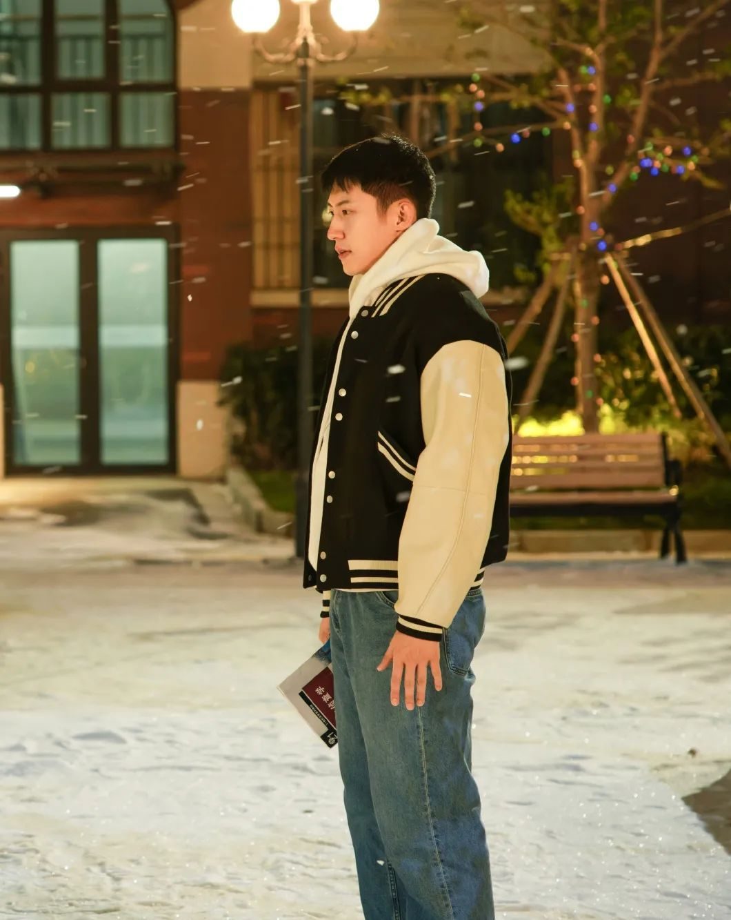 棒球服加卫衣是秋冬很多男生都会选的衣服,他就用了卫衣化解棒球服的学院感,这样一穿全身就变得非常休闲和减龄。想要让你自己看上去小几岁的男生,建议你们试试看这样的路数。