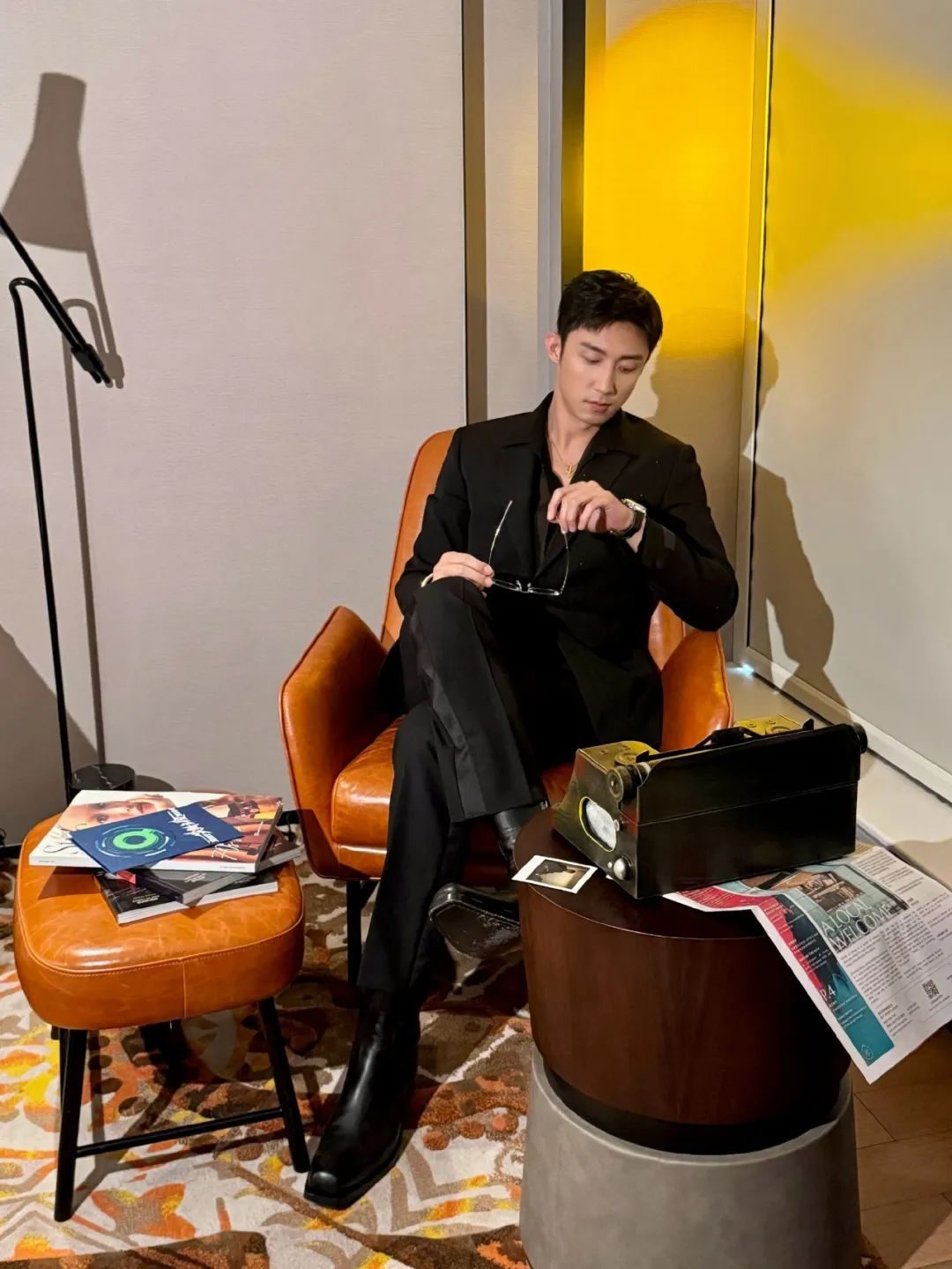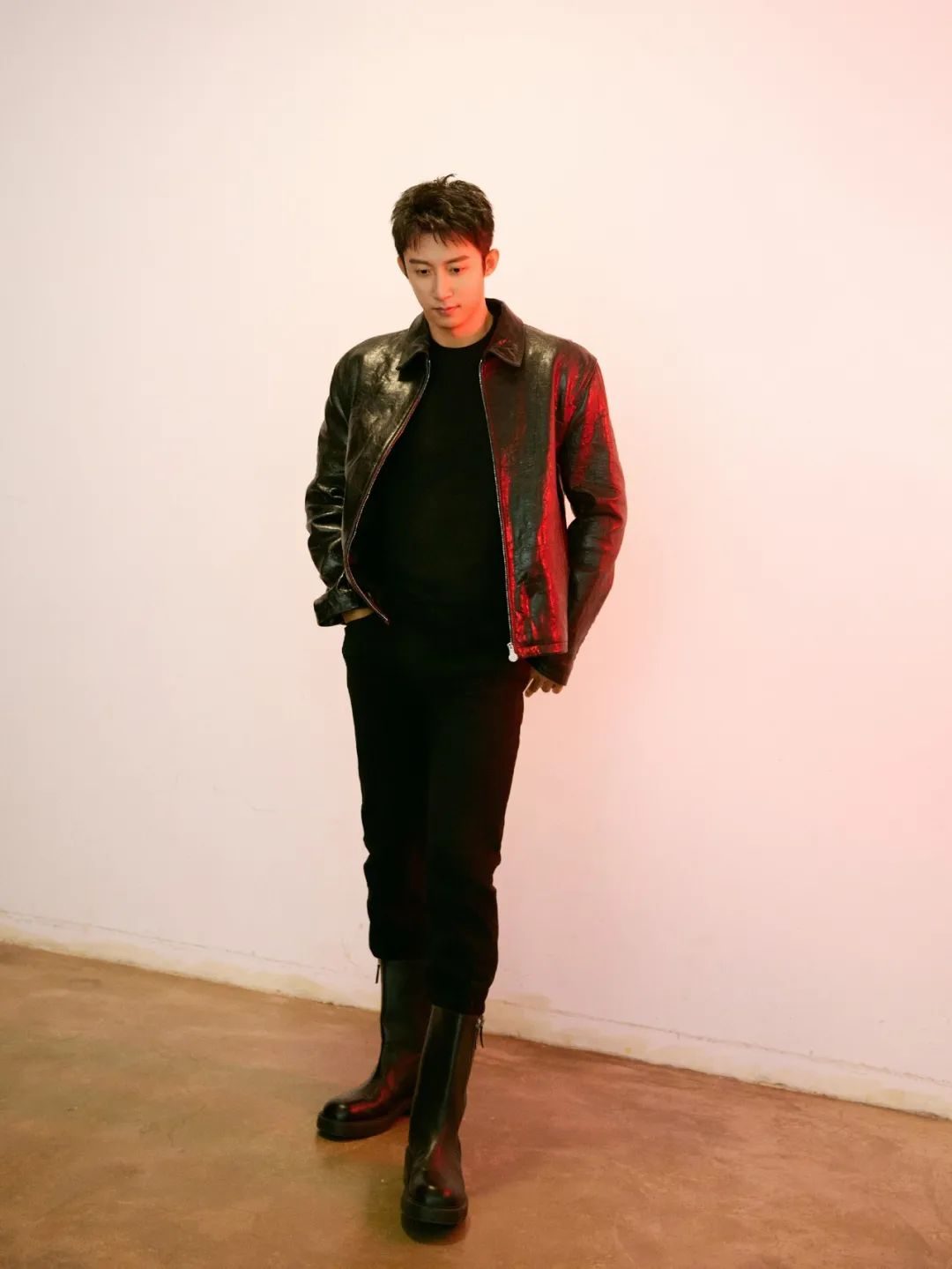 在穿皮衣的时候,他也是比较有自己风格的,里面穿oll black的时候,他就会把鞋子换成更加有风格的靴子,整个人看上去就非常凌厉以及有帅气感。对很多男生来说,这招也是很能让你气场增加的方式。