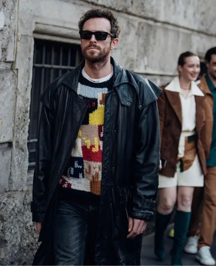 还有一些人喜欢比较有童趣感,就可以选一件彩色毛衣,会让你整个人的基调比较fun。下面这身哪怕搭的是做旧感的皮衣,你也不会觉得他是上世纪的人,反而觉得他看上去很老钱。